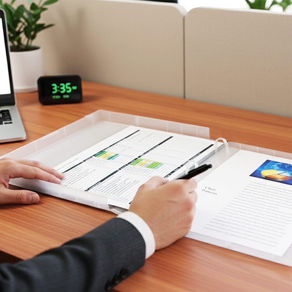 Our 1 5-inch binder series stands out with its professional-grade materials and attention to detail. The 1 5 inch binders feature reinforced edges that resist wear and tear, making them perfect for frequent use in busy environments. Every 1.5-inch binder comes equipped with two interior pockets for loose papers and quick-access documents, while the 1.5-inch binder with a clear cover allows for easy customization of both front and back displays.