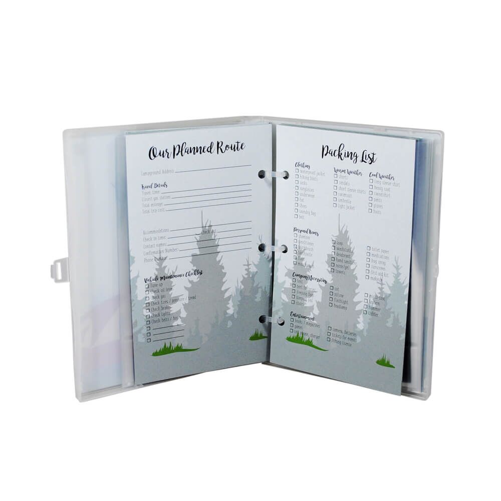 The UniKeep Camping Journal includes decorative, pre-printed content sheets for travel details and route planning; packing, to-do, and supplies lists, and a meal planner.
