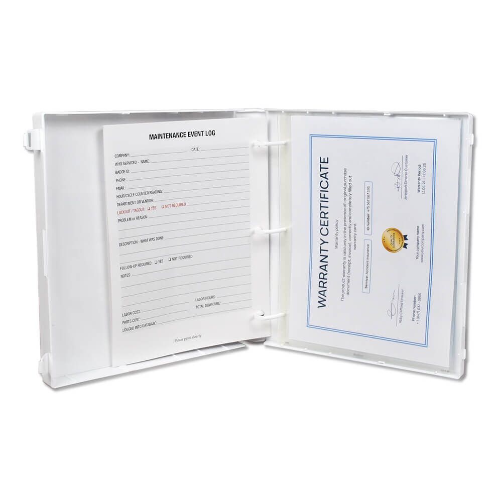 Available in 3 common sizes (0.5-inch, 1-inch, and 1.5-inch), our maintenance logs for equipment come equipped with either plastic rings or extra heavy-duty metal rings (depending on your preference). You also have the option to choose from a bilingual binder as well. This unique combination of features is a UniKeep exclusive. Made from durable polypropylene, UniKeep Equipment Maintenance Logs are built to last in harsh environments. With a unique snap-locking, fully enclosed design, contents are always safe and protected from spills and debris. We recommend you also consider our archival sheet protectors and tab dividers to maximize your safety data’s organization and clarity. Also, includes 16 content pages printed back to back and 5 full size page protectors.