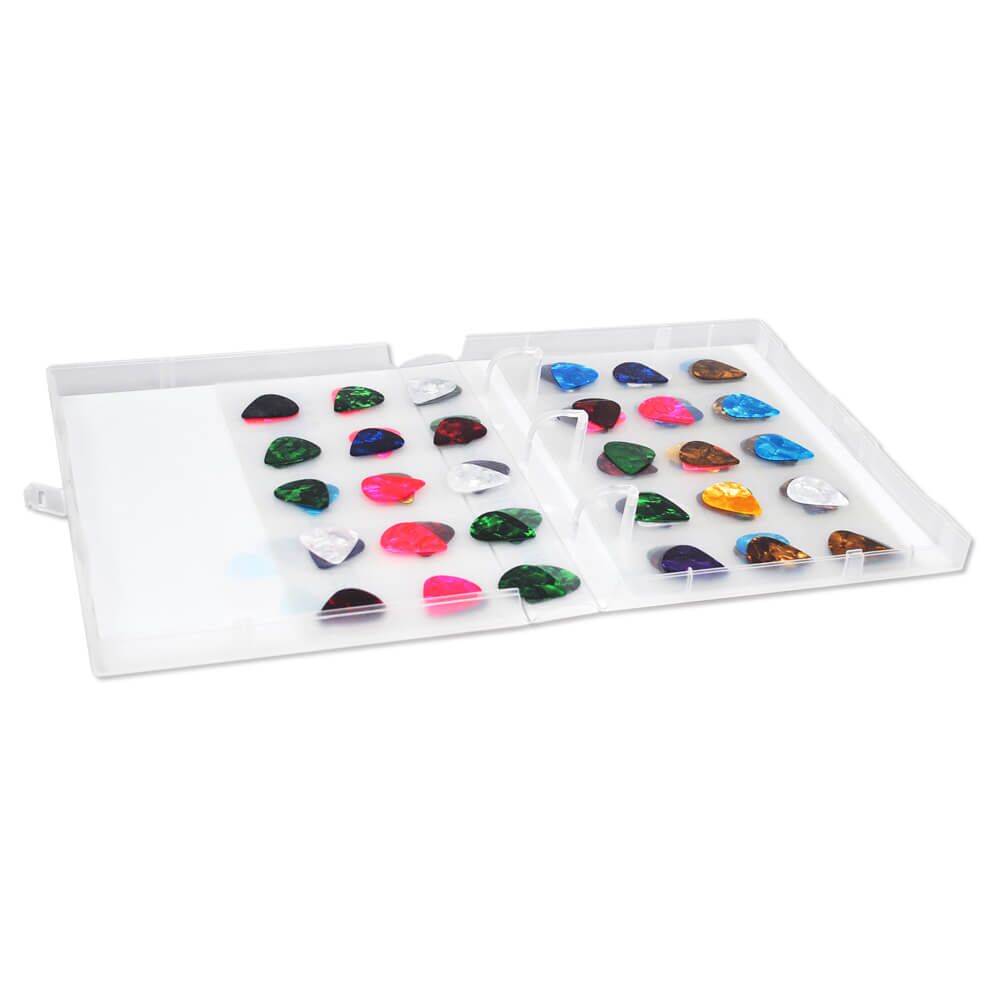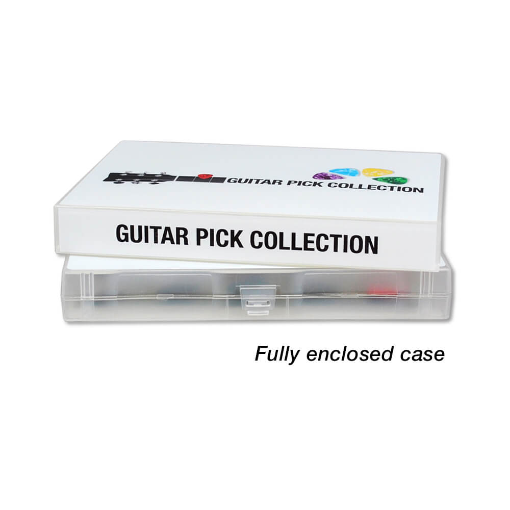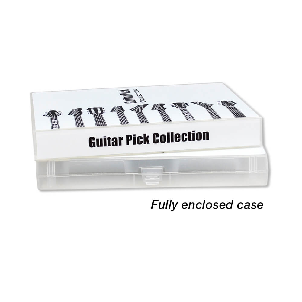 This fully-enclosed, snap-locking case prevents any picks stored loose inside the case from falling out. Three poly rings open easily for quick removal and/or rearranging of your pick pages. This compact case will fit on a shelf or inside a backpack or gig bag.