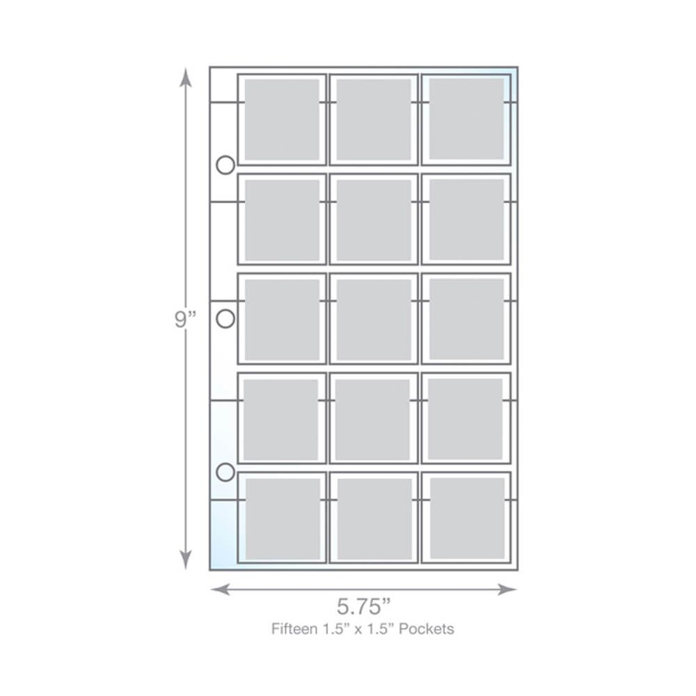 | Capacity: | Each page has 15 pockets holding 1.5" inserts |