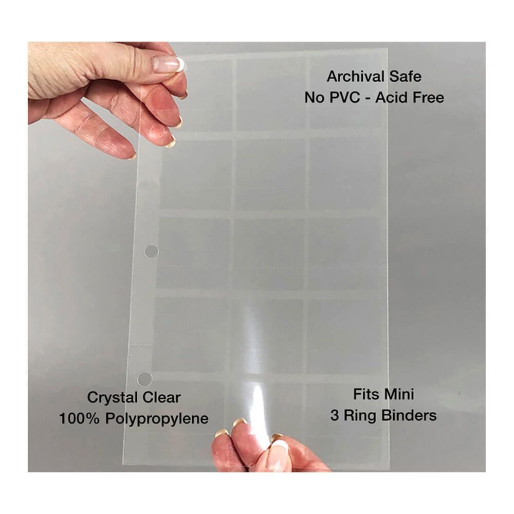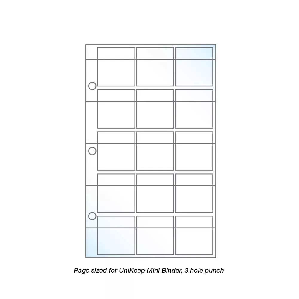 Mini Pocket Page Protectors are the perfect way to store, protect, and organize your miniature collections, such as guitar picks or buttons. This unique page is designed with an upper flap on each pocket that prevents items like guitar picks or buttons from falling out. With 15 pockets per page, you can store more stuff in less space. Pockets hold up to 1.5″ x 1.5″ inserts. Mini Pocket Pages fit securely inside UniKeep Mini Binders or any other A5 size binder.