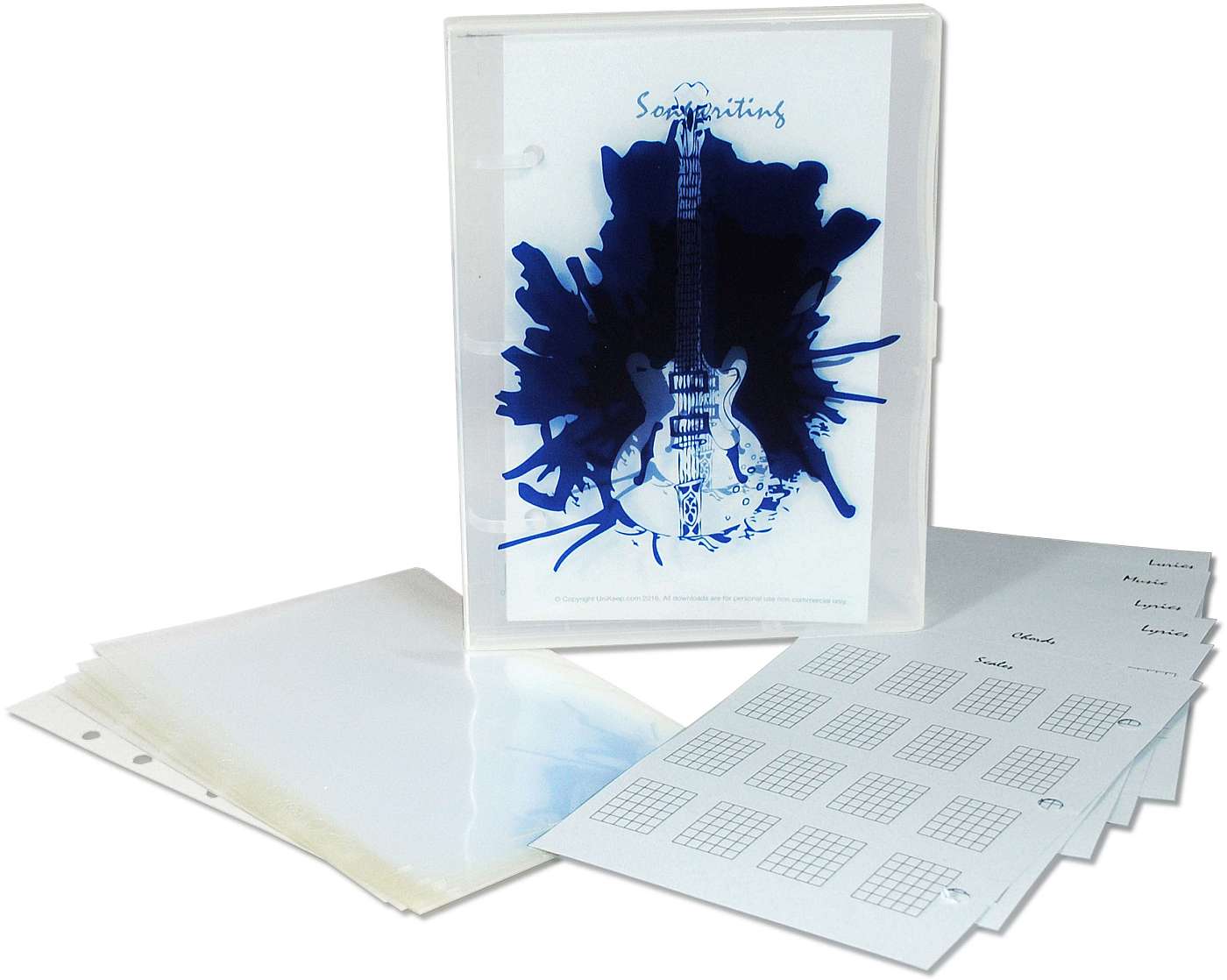 The UniKeep Acoustic Guitar Songwriting Journal is perfect for capturing musical ideas and developing them into that perfect song. Enough pages to write 21 amount of songs. Fully enclosed and snap locking makes it easy to store picks, loose notes, and tuning forks. Small and compact, will fit in a bag or a purse. A great tool for any skill level. Easily reference your songs, harmonies, melodies, and lyrics. The blank chord and scale sheets allow you to personalize and fill in common and favorite forms.