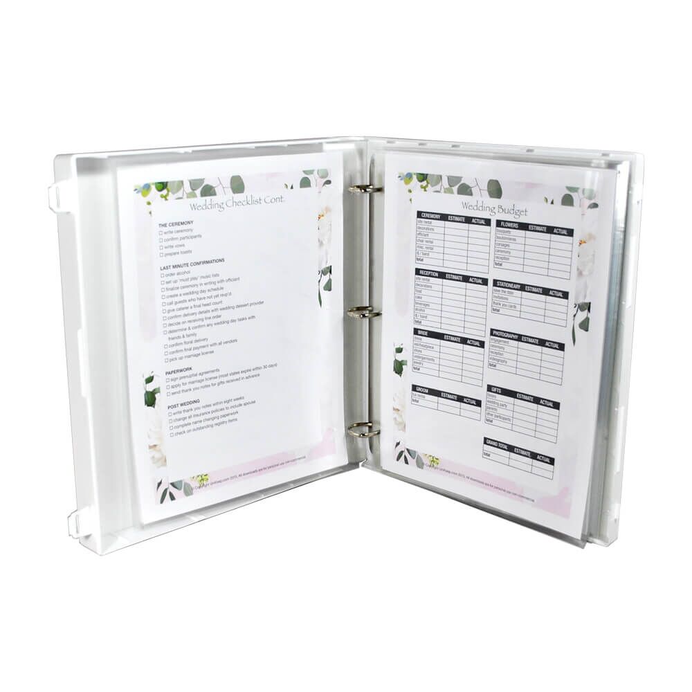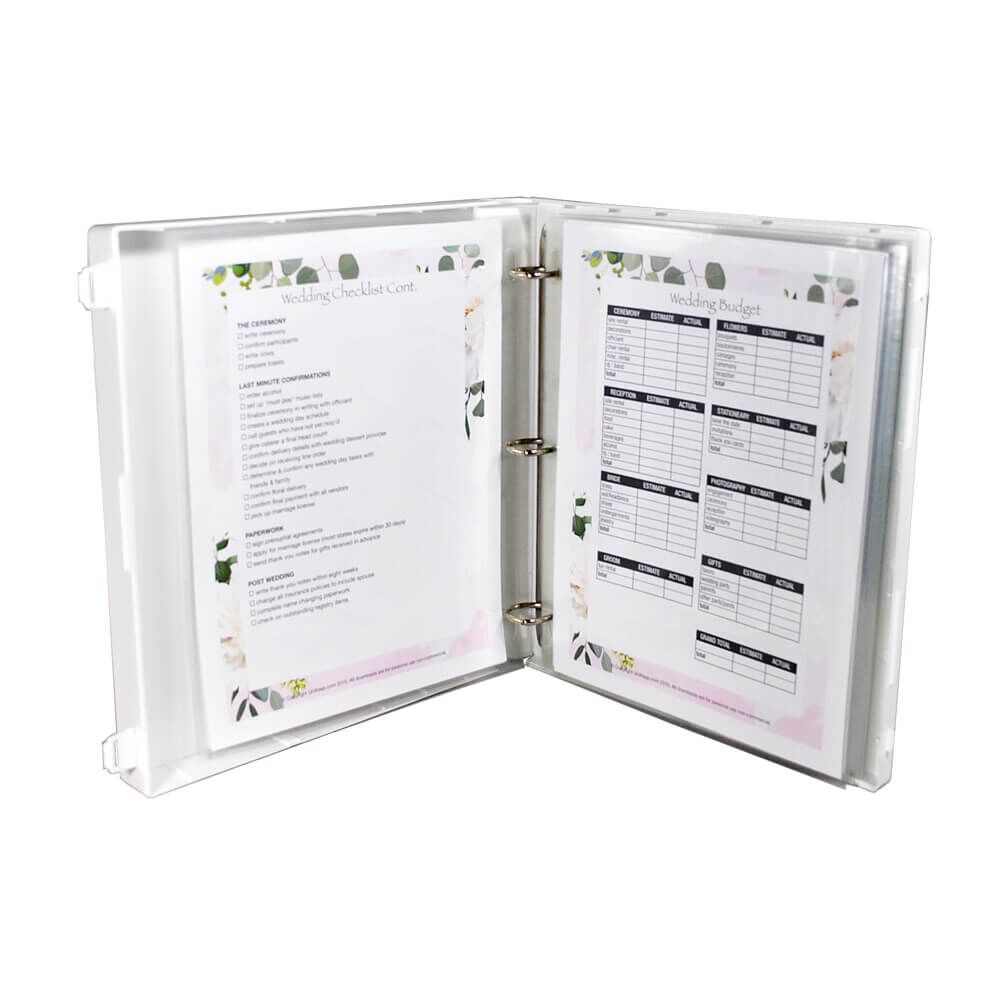 The Wedding Planner Binder comes in two chic designs: Floral and Elegant. After the wedding is over, this keepsake is ideal to look back on and reminisce about the hard work that made your special day so memorable. Our safe and durable snap-locking poly rings allow you to add and remove photos and other moments from your special day to the binder afterward as well.